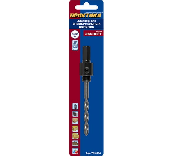Адаптер ПРАКТИКА держатель со сверлом для универс коронок 16-30 мм, шестигранный хвостовик