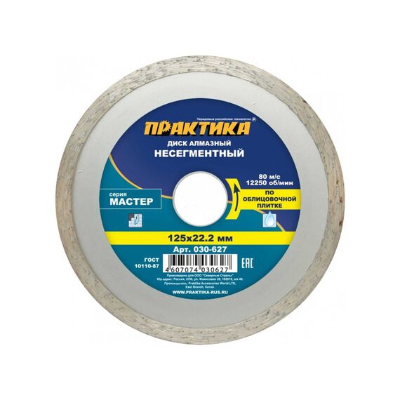 Диск алмазный несегментный ПРАКТИКА "Мастер" 125x22 мм коробка