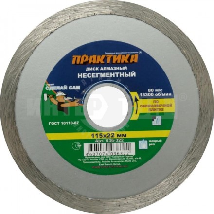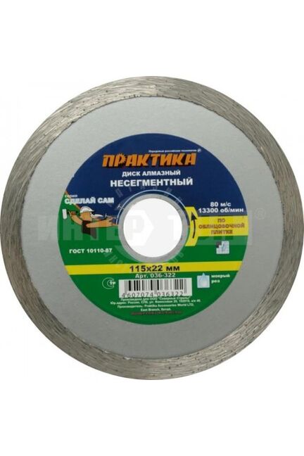 Диск алмазный несегментный ПРАКТИКА "Сделай Сам" 115х22 мм для керамической плитки