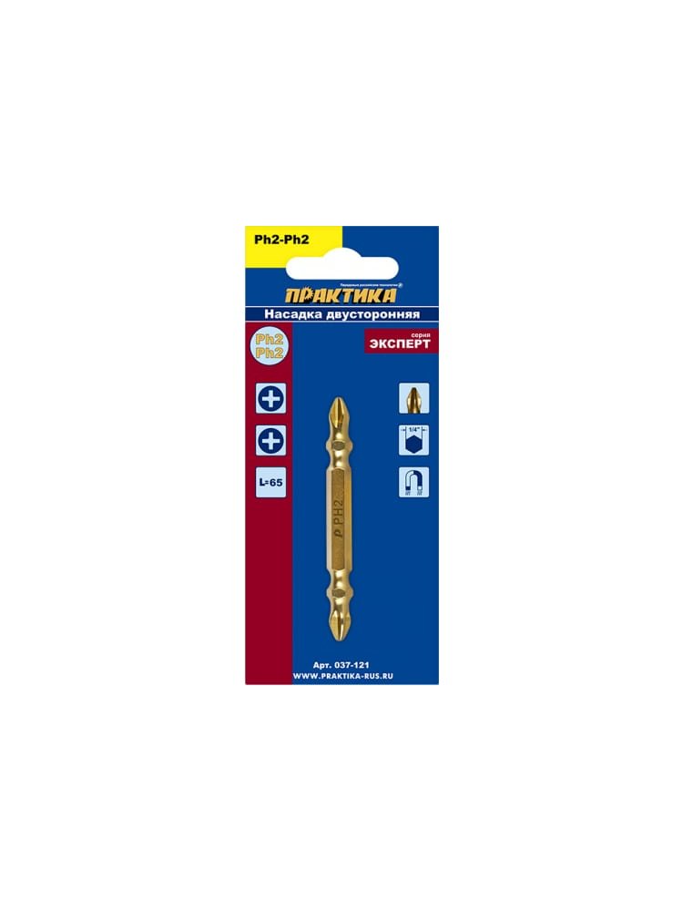 Идеальный выбор для профессионального и бытового использования: двусторонняя отверточная бита PH2/PH2 65 мм с титановым покрытием превосходно справляется с закручиванием крепежа в дерево, металл и пластик. Универсальный размер подходит для большинства стандартных шуруповёртов и отверток.