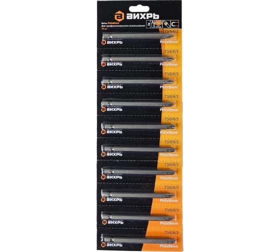 Бита Вихрь - предназначена для использования в качестве насадок в шуруповёртах, аккумуляторных отвёртках, ручных и реверсивных отвёртках со сменными насадками. Изготовлены биты из высококачественной инструментальной стали марки S2. Наконечник типа PН2 (Phillips) - крестообразный наконечник. Длина бит 90 мм. Твердость биты составляет 59-62 HRС. Основу биты составляет шестигранный хвостовик размером 6,35 мм (1/4 дюйма). Длинная PH2 бита 90 мм для работы в труднодоступных местах, износостойкая, с точной посадкой и универсальной совместимостью.