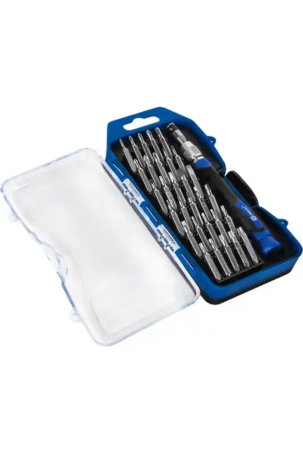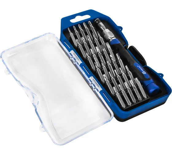 Отвёрточная рукоятка в наборе оснащена встроенным магнитом, благодаря которому биты надёжно зафиксированы при работе. Рукоятка и бита в составе набора выполнена из хром-ванадиевой стали. Компактный кейс выполнен из пластика с резиновыми вставками. Удлинитель Телескопическая отвёрточная рукоятка Биты: PH000, PH00, PH0, PH1, PH2, PZ00, PZ0, PZ1 SL1, SL1.5, SL2, SL2.5, SL3, SL3.5, SL4, T4, T5, T6, T7, T8, T9, T10, T15, T20, HEX 0.9, HEX 1.3, HEX 1.5, HEX 2, HEX 2.5, HEX 3. Универсальный набор: 32 биты и удобная отвертка для всех видов крепежа. Прочный кейс, надежная сталь, высокая износостойкость и полный комплект насадок.