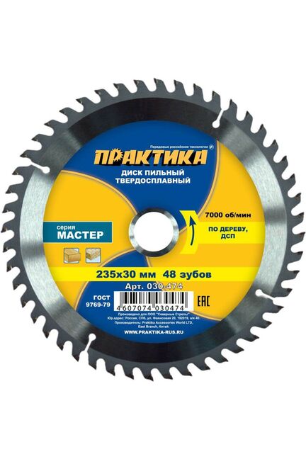 Пильные диски по дереву и ДСП. ГОСТ 9769-79. Серия "Мастер". Высококачественные пильные диски для ручных дисковых пил и станков. Твердость тела HRC 45-46, напаек из карбида вольфрама (сплав ВК8) HRC. 90-93. Угол атаки зуба + 15°. Пильный диск 235 мм, 48T, для чистого и точного реза древесины, ДСП и фанеры, совместим с циркулярными пилами, стойкий к износу.