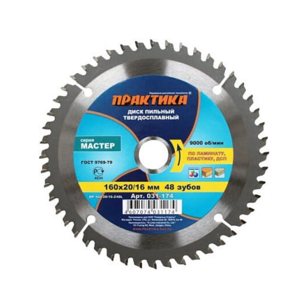Пильные диски по ламинированным материалам, ДСП, пластику. ГОСТ 9769-79. Серия "Мастер". Высококачественные пильные диски для ручных дисковых пил и станков. Твердость тела HRC 45-46, напаек из карбида вольфрама (сплав ВК8) HRC. 90-93. Угол атаки зуба + 10°. Для чистого и точного распила ламината и ДСП, 48 тонких зубьев, диаметр 160 мм, универсальная посадка 20/16 мм, высокая износостойкость.