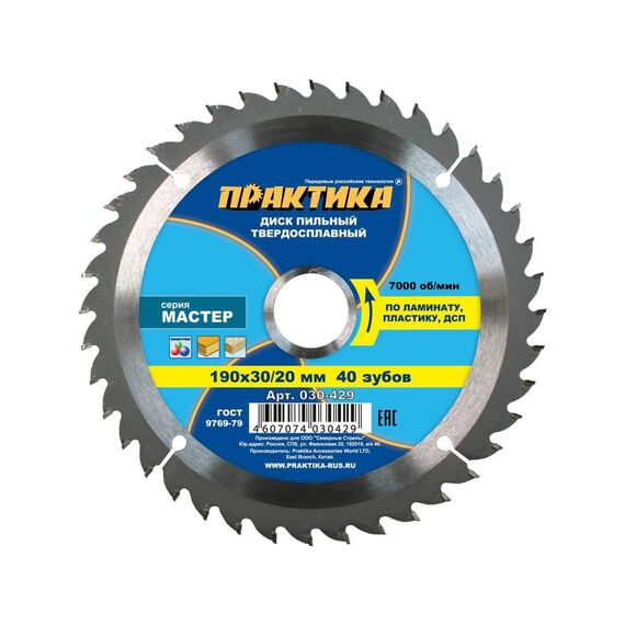Пильные диски по ламинированным материалам, ДСП, пластику. ГОСТ 9769-79. Серия "Мастер". Высококачественные пильные диски для ручных дисковых пил и станков. Твердость тела HRC 45-46, напаек из карбида вольфрама (сплав ВК8) HRC. 90-93. Угол атаки зуба + 10°. Идеален для резки ламината и ДСП, 190 мм, 40 зубьев, чистый рез без сколов, универсальная посадка 30/20 мм, долгий срок службы.