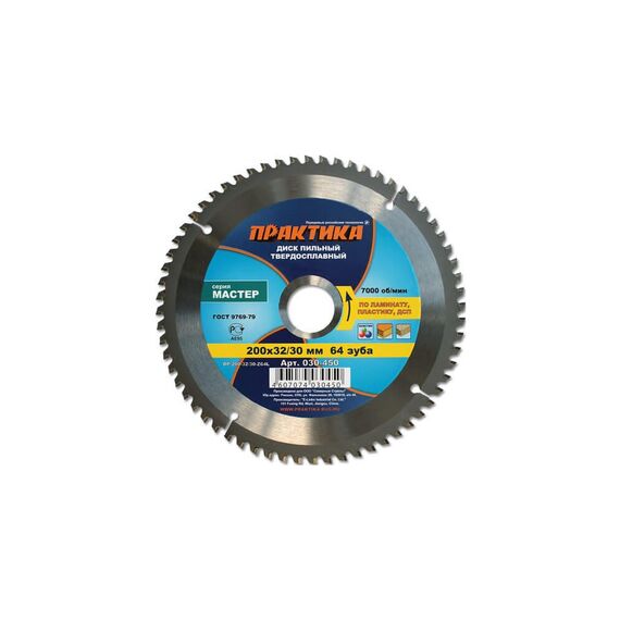 Пильные диски по ламинированным материалам, ДСП, пластику. ГОСТ 9769-79. Серия "Мастер". Высококачественные пильные диски для ручных дисковых пил и станков. Твердость тела HRC 45-46, напаек из карбида вольфрама (сплав ВК8) HRC. 90-93. Угол атаки зуба + 10°. Пильный диск 200 мм, 64 зуба, чистый распил ламината и ДСП без сколов, универсальная посадка 32/30 мм, длительный ресурс и точность реза.