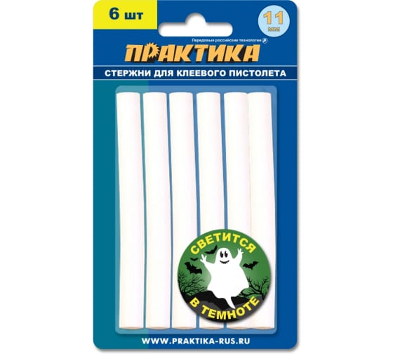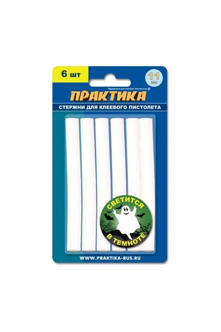 Клей для клеевого пистолета ПРАКТИКА белый, светящийся в темноте, 11x100 мм, 6шт