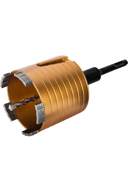 тип хвостовика - SDS-plus, диаметр - 82 мм, разборная - да, хвостовик - есть, центрирующее сверло - есть, количество режущих элементов - 5 шт, алмазная - да, по камню - да, по бетону - да, по железобетону - да, по кирпичу - да, по граниту - нет, по керамограниту - нет, ударного сверления - нет, вид режущих элементов - сегменты алмазные, с микроударом - нет Алмазная коронка 82 мм с 5 турбо сегментами для сверления бетона и кирпича, SDS-Plus, безударная, обеспечивает точный и чистый рез.
