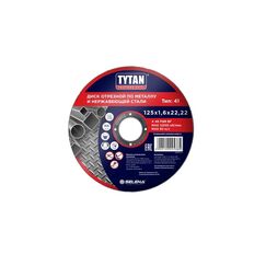 Диск отрезной по металлу и нержавеющей стали Professional Tytan Плоский отрезной абразивный диск по металлу и нержавеющей стали на основе электрокорундовых абразивных материалов с упрочняющими элементами на бакелитовой связке со среднем размером зерна. Используется для резки металлических труб, деталей и заготовок, строительной арматуры и других материалов как сменный элемент для угловых шлифовальных машин (УШМ). Для чистого и точного реза металла и нержавейки, толщина 1,6 мм, повышенная износостойкость, подходит для всех стандартных болгарок.