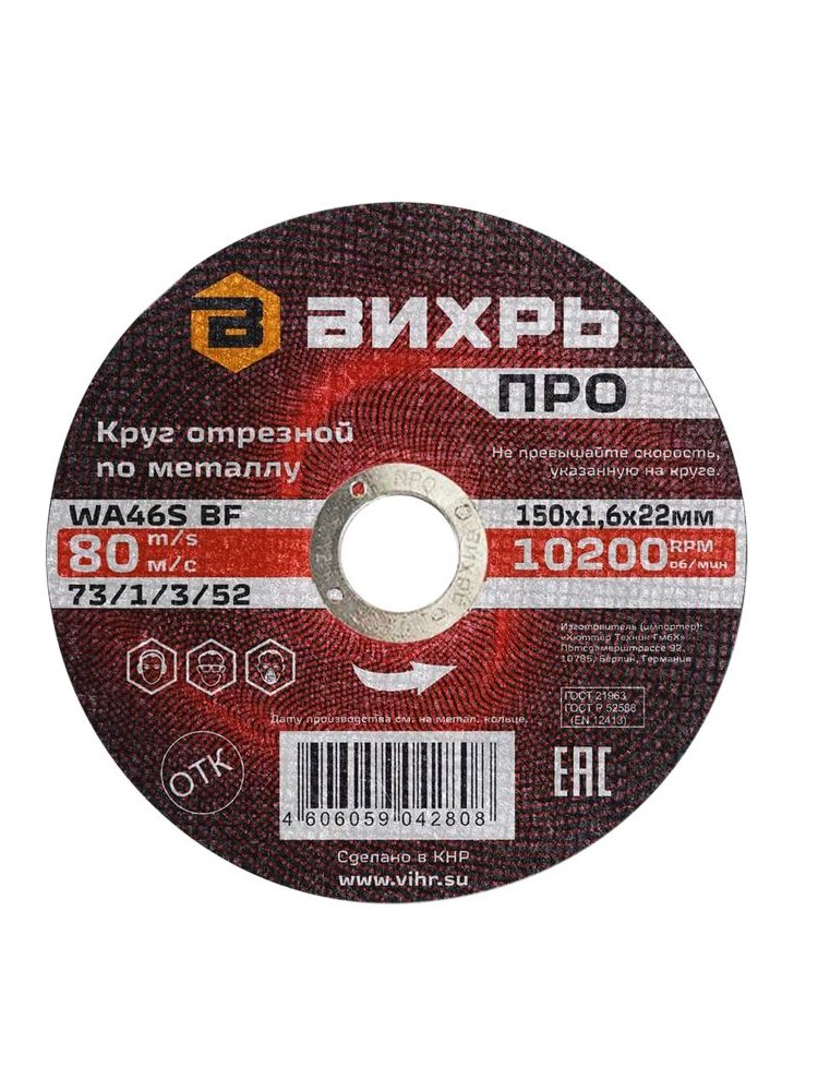 Круг отрезной по металлу ВИХРЬ ПРО 150х1,6х22 мм