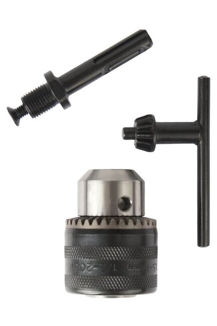 Наборы. Патрон с переходником. Серия "Профи". Готовый вариант для возможности использования Вашего перфоратора в качестве дрели для сверления металла и дерева. Ключевой патрон с адаптером SDS+, надежная фиксация сверл 1,5–13 мм, универсален для перфораторов, прочный металлический корпус.