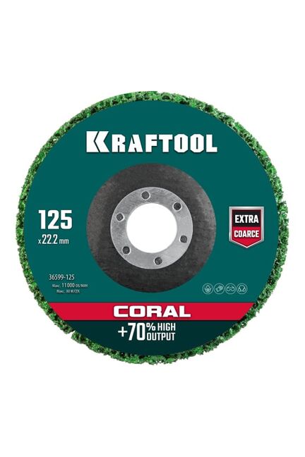 Полимерно-шлифовальный синтетический абразивный круг KRAFTOOL Coral 125x22.2 мм 36599-125 обладает максимально возможной производительностью при зачистке металла и древесины от ржавчины, застарелых лакокрасочных покрытий,грунтовок и других отделочных материалов. Эффективная шлифовка металла, пластика и дерева, долгий ресурс, размер 125×22 мм, подходит для УШМ, минимальный нагрев и ровный износ.