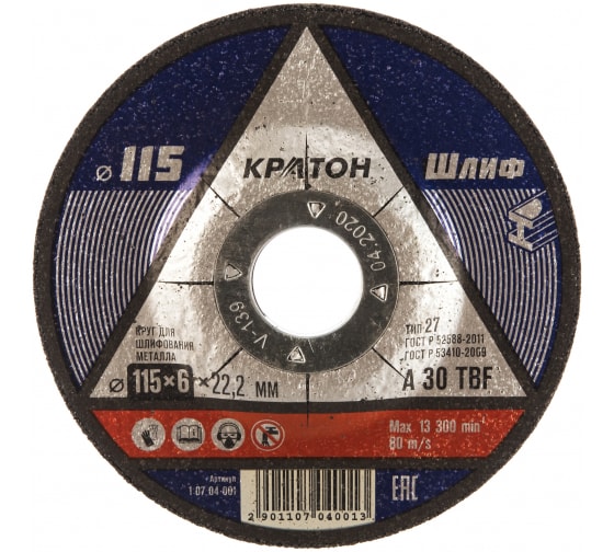 Диск шлифовальный Кратон предназначен для любых видов шлифовальных работ с конструкциями, деталями из жаропрочных сталей, чугуна, цветных металлов, твердых сплавов и минеральных материалов. Диск предназначен для подготовки поверхности к последующей работе с ней или для финальной обработки. Данный шлифовальный круг применяется для финальной обработки поверхности, поэтому в нём используется самый мелкий абразив. Быстрая и качественная зачистка металла, надежность, износостойкость, универсальность для большинства УШМ, диаметр 115 мм, толщина 6 мм.