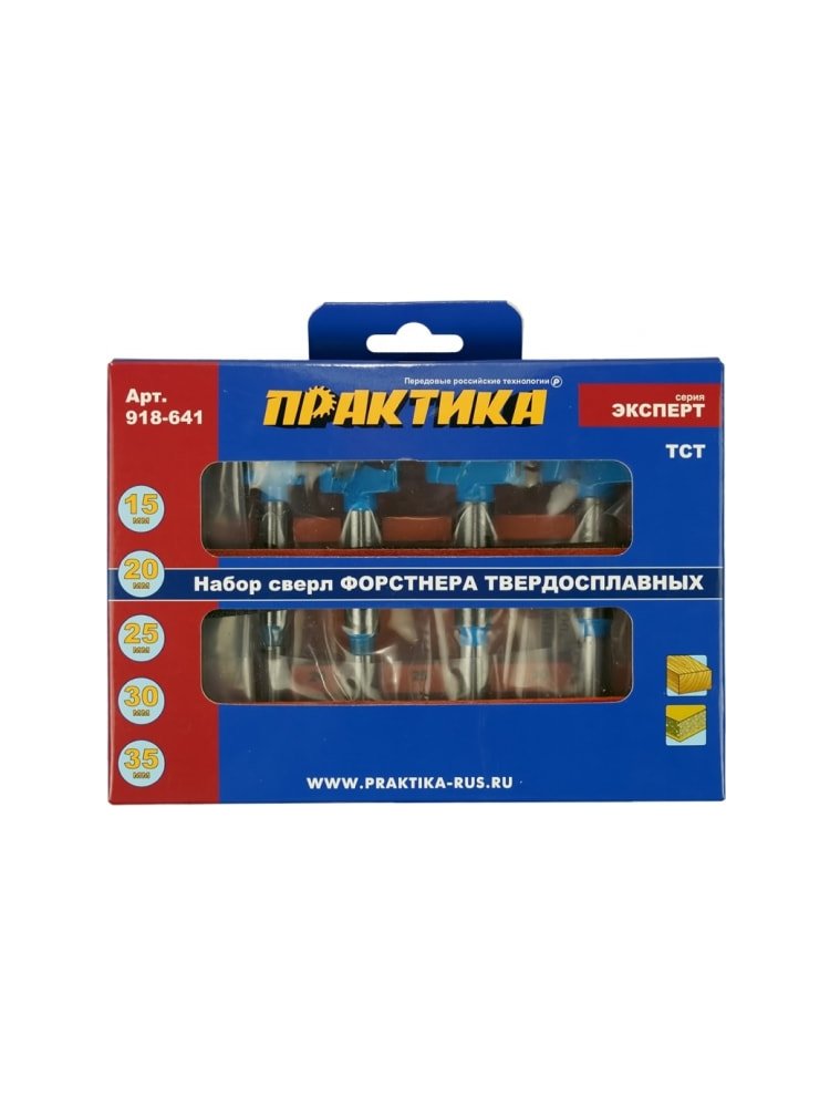 Набор сверл Форстнера ПРАКТИКА 5шт, твердосплавных 15, 20, 25, 30, 35 мм, в дер. кейсе