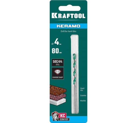 Сверло по керамограниту KRAFTOOL Keramo 4x80 мм 29175-080-4 благодаря специальной твердосплавной пластине и алмазной заточке режущих кромок уверенно проходит через керамогранит,мрамор,гранит и прочие твердые материалы. Используется с дрелями и перфораторами со сверлильным патроном в безударном режиме сверления. При работе по бетону и кирпичу допускается сверление с ударом. Сверло диаметром 4 мм для аккуратного сверления керамогранита и плитки без сколов и трещин, прочный наконечник, подходит для дрели.