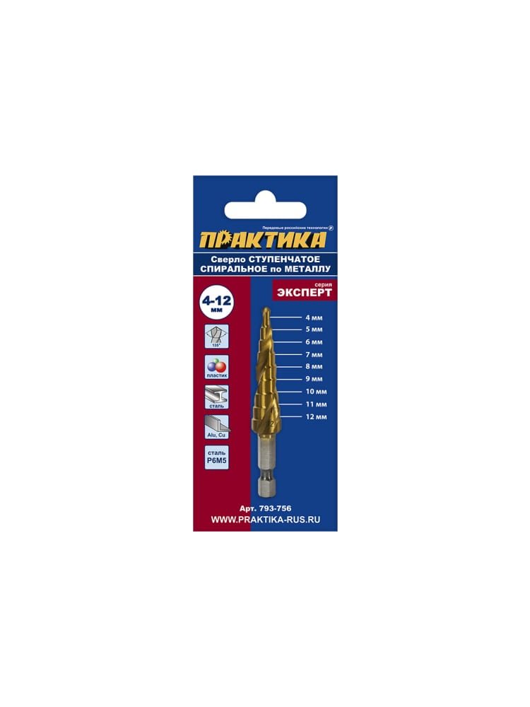 Сверло по металлу ступенчатое спиральное ПРАКТИКА ЭКСПЕРТ 4-12 мм, шаг 1 мм, хвост 1/4