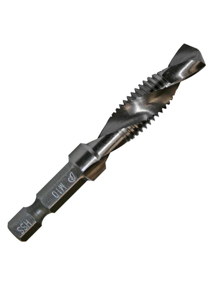 Сверла-метчики комбинированные для сквозных отверстий. Серия "Эксперт". Сверло - метчик комбинированное предназначено для сверления отверстия и нарезания резьбы при помощи дрели. Для обработки листовых материалов и профилей из легированных и не легированных сталей с пределом прочности на растяжение до 900 Н/мм2 и цветных металлов. Изготовлено из быстрорежущей стали Р6М5, шлифованное, хвостовик 1/4’’. Сверление, нарезание резьбы и зенковка производится за один рабочий проход, очистка резьбы - на обратном ходу. Резьба метрическая DIN ISO 13, правосторонняя. Допуск ISO 2 / 6Н. Боковая поверхность - затыловочная шлифовка. Для сверления отверстий под резьбу и нарезки резьбы М10 в металле. Быстро, точно, подходит для большинства дрелей. Длина 72 мм, диаметр 8,5 мм.