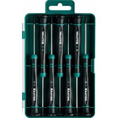 Набор отверток для точных работ КОБАЛЬТ Ultra Grip 50мм служит для отворачивания и заворачивания мелких резьбовых крепежных элементов в часах, бытовой и электронной технике. При изготовлении используется устойчивая к коррозии и деформации хромованадиевая сталь 6150CrV с закалкой 51-54HRC, благодаря чему инструмент имеет длительный срок службы. Специальная рукоятка Ultra Grip с вращающимся упором обеспечивает точное завинчивание крепежа. Для удобства работы предусмотрен магнитный наконечник, который не позволяет потерять мелкие детали. Удобства хранения и транспортировки набора обусловлено входящим в комплект поставки пластиковым кейсом. Набор из 7 отверток для точных работ в кейсе, магнитные наконечники, Ultra Grip рукоятки, длина 50 мм, для ремонта электроники и аксессуаров.