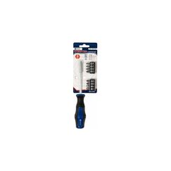 Отверточная рукоятка Ultra Grip с набором бит КОБАЛЬТ используется для работ с резьбовыми соединениями различного профиля. К отвертке прилагается набор бит: SL5 мм, SL6 мм, PH1, PH2, PZ1, PZ2, T15, T20, изготовленных из хром-ванадиевой стали. Для упрочнения рабочих частей применяется закалка до твердости 51 - 54 HRC. Стальные стержни оснащены магнитами, за счет этого происходит удержание и контроль крепежа во время работы. Специальная рукоятка удобно лежит в руке, а с помощью крючка инструмент можно повесить на пояс. Универсальный набор с надежной отверткой и 8 битами для ремонта и монтажа. Прорезиненная рукоятка, магнитный держатель, компактный кейс.