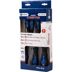Набор отверток диэлектрических Ultra Grip КОБАЛЬТ состоит из ручного инструмента, предназначенного для завинчивания и отвинчивания резьбовых соединений. Набор подходит как для винтов с крестовой шляпкой, так и с плоской. Диэлектрическое покрытие дает возможность работать под напряжением. Эргономичная форма ручек способствует удобному захвату  и предотвращает соскальзывание при работе. Набор из 6 диэлектрических отверток для безопасной работы под напряжением до 1000 В, с эргономичными рукоятками и износостойким жалом.