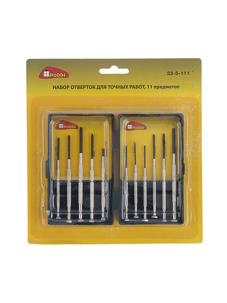 Набор часовых отвёрток, 11 предметов Hobbi для ремонта часовой техники. В наборе находится 11 предметов: все необходимые насадки для работы с мелкими механизмами. 11 прочных отверток для точных работ с мелкими деталями: ремонт часов, электроники, очков. Удобная упаковка, отличное качество стали.