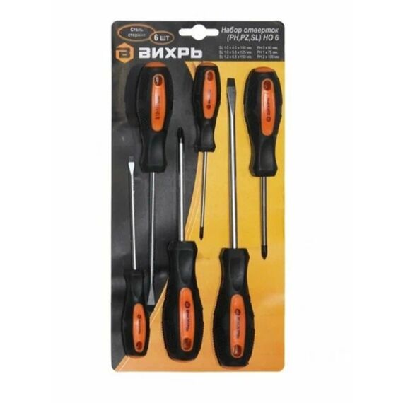 Набор отвёрток Вихрь PH,SL НО 6 подойдет для шлицевого и крестообразного крепежа различных размеров. Удобные широкие рукоятки обеспечивают рычаг для вращения, что облегчает монтаж и демонтаж винтов вне зависимости от их сложности. Набор из 6 прочных отверток разных типов для крестовых и прямых шлицов, эргономичные рукоятки, универсальность применения,  для ремонта и монтажа.