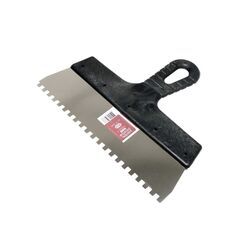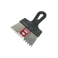 Шпатель из нержавеющей стали, пластмассовая ручка. Назначение: Для заделки швов и трещин, нанесения и выравнивания строительных растворов. Полотно из нержавеющей стали, зуб 6х6 мм, удобная пластиковая ручка. Идеален для нанесения клея и штукатурки на стены и пол.