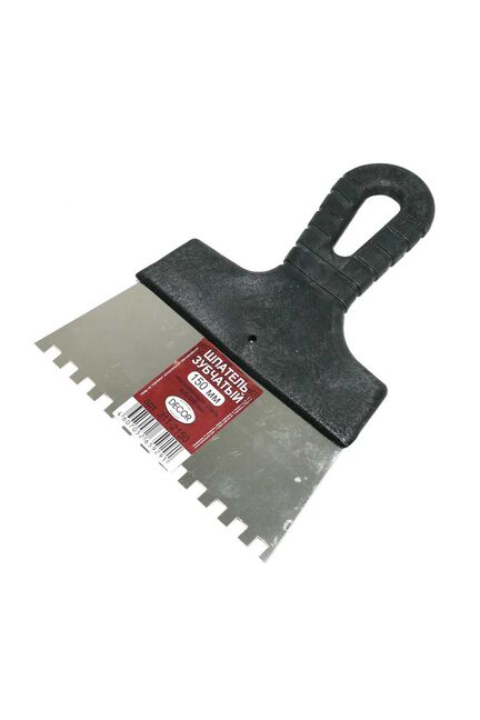 Шпатель из нержавеющей стали, пластмассовая ручка. Назначение: Для заделки швов и трещин, нанесения и выравнивания строительных растворов. Полотно из нержавеющей стали, зуб 6х6 мм, удобная пластиковая ручка. Идеален для нанесения клея и штукатурки на стены и пол.