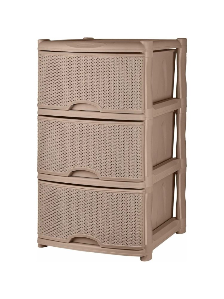 Стильный и практичный трехсекционный комод отлично подойдет для хранения инструментов, стройматериалов, бытовых принадлежностей и аксессуаров как в мастерских, гаражах, так и в жилых помещениях. Благодаря имитации плетения ротанг и трендовому цвету морской песок комод гармонично впишется в современный интерьер или рабочее пространство.