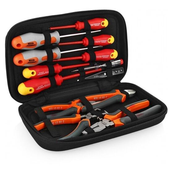 Набор электрика Кратон - комплект из 13 предметов, который предназначается для профессионалов или любителей. Все приспособления изготавливаются из прочных материалов, устойчивых к износу. Набор из 13 инструментов для электромонтажа и ремонта в компактном кейсе, прочные материалы и удобные ручки обеспечивают надежную работу.