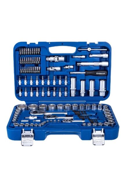 - Комплектация: торцевые головки 1/4'' и 1/2'', трещотки, удлинители, кардан, свечные головки, воротки, биты, шестигранники.