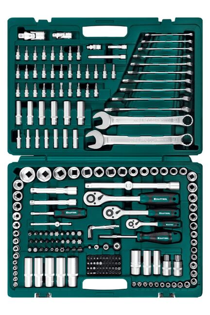 • 216 предметов: широкая гамма торцевых и свечных головок, трещоток, удлинителей, бит, ключей и аксессуаров