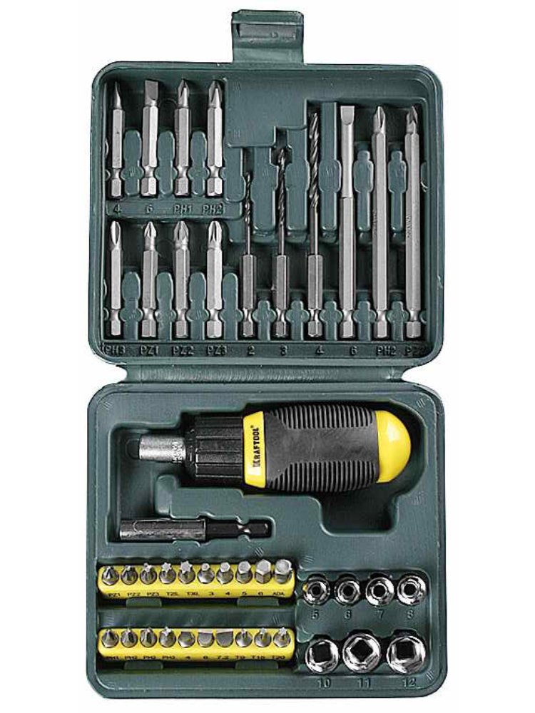 - 26 сменных бит и 9 торцевых головок — охват наиболее востребованных профилей и размеров.