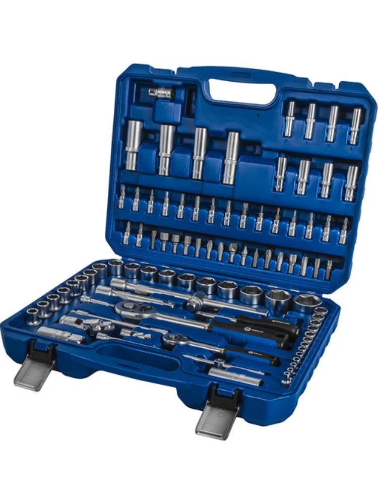 94 предмета, головки 1/4" и 1/2", хром-ванадиевая сталь, кейс, универсальность — для ремонта, монтажа, авто и бытовых работ.