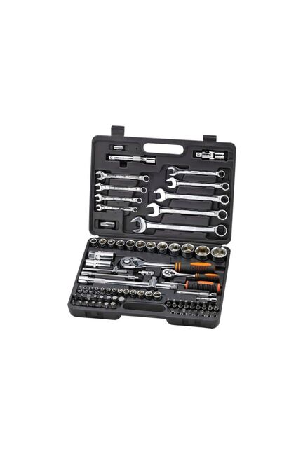 • 82 предмета в комплекте: трещотки 1/2" и 1/4", головки, удлинители, битодержатель, разнообразные насадки и аксессуары.