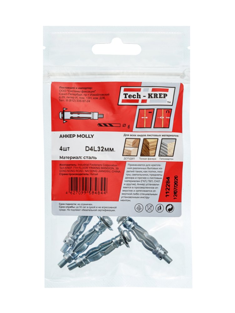 Анкер (дюбель) Молли М4х32 от Tech-Krep представляет собой надежный крепежный элемент, предназначенный для монтажа в полые материалы. Изготовлен из высококачественной стали, что обеспечивает прочность и долговечность крепления. Комплект включает 4 штуки, упакованных в удобный пакет. Размер М4х32 подходит для большинства задач, связанных с креплением легких конструкций. Дюбель раскрывается при затягивании, создавая надежное сцепление с поверхностью, что особенно важно для гипсокартона и других пустотелых материалов.