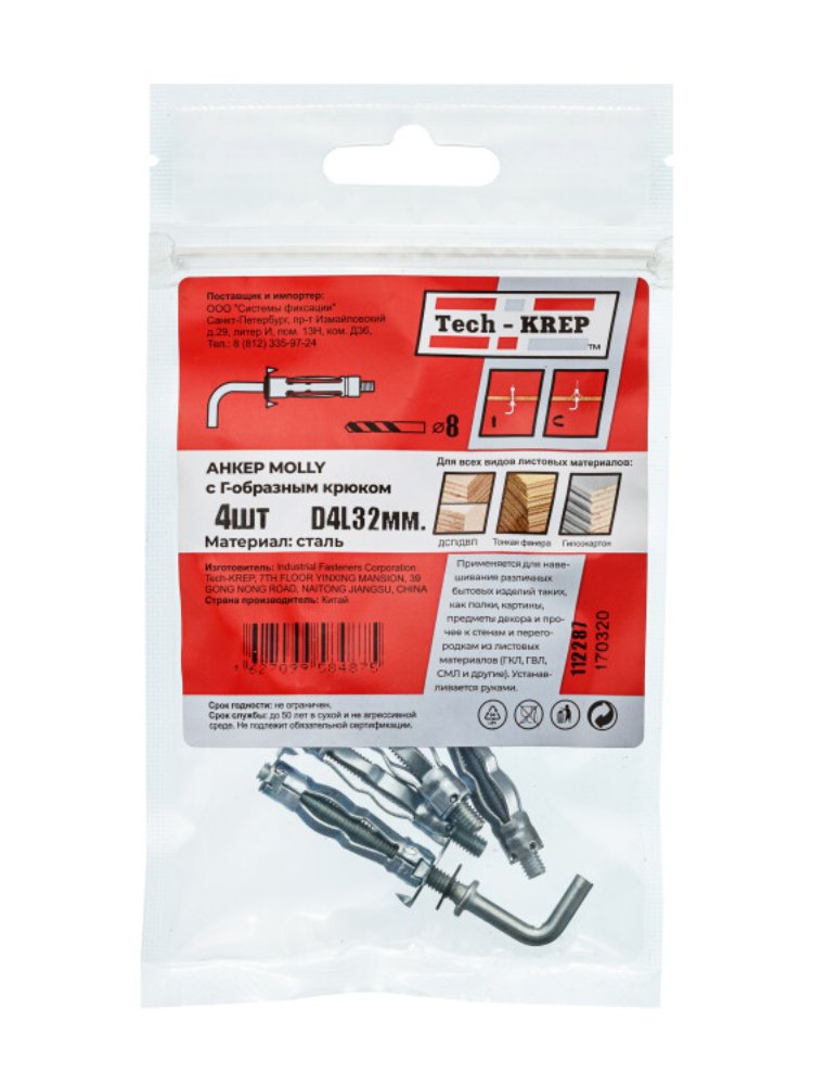 Анкер (дюбель) Молли W с крюком М4х32 от Tech-Krep представляет собой надежный крепежный элемент, предназначенный для монтажа в пустотелые основания, такие как гипсокартон, ДСП или тонкие панели. Изготовлен из прочной стали с антикоррозийным покрытием, что обеспечивает долговечность и стойкость к внешним воздействиям. Крюк позволяет удобно подвешивать различные предметы, а конструкция дюбеля гарантирует прочное и безопасное крепление за счет раскрытия лепестков внутри материала основания. В упаковке 4 штуки, что оптимально для небольших ремонтных или монтажных работ.