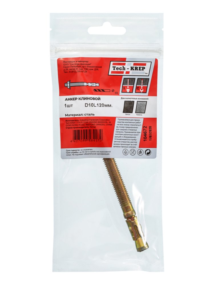 Анкер клиновой 10х120 мм от Tech-Krep – это надежный крепежный элемент, предназначенный для создания прочных соединений в бетоне и других твердых материалах. Изготовлен из высококачественной углеродистой стали с антикоррозийным покрытием, что обеспечивает долговечность и устойчивость к внешним воздействиям. Диаметр анкера составляет 10 мм, длина – 120 мм, что позволяет использовать его для крепления конструкций средней и высокой нагрузки. Установка проста и не требует специальных навыков: достаточно просверлить отверстие, вставить анкер и затянуть гайку для надежной фиксации за счет расклинивания. Подходит для монтажа в условиях повышенной влажности благодаря защите от коррозии.
