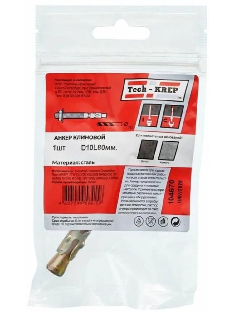 Анкер клиновой 10х80 мм от Tech-Krep представляет собой надежный крепежный элемент, предназначенный для создания прочных соединений в бетоне и других твердых материалах. Изготовлен из высококачественной стали с антикоррозийным покрытием, что обеспечивает долговечность и устойчивость к внешним воздействиям. Конструкция анкера включает клиновой механизм, который при затягивании гайки расширяется внутри отверстия, создавая максимальную фиксацию. Диаметр 10 мм и длина 80 мм делают его универсальным для различных строительных задач. Подходит для установки в предварительно просверленные отверстия, обеспечивая высокую нагрузочную способность.