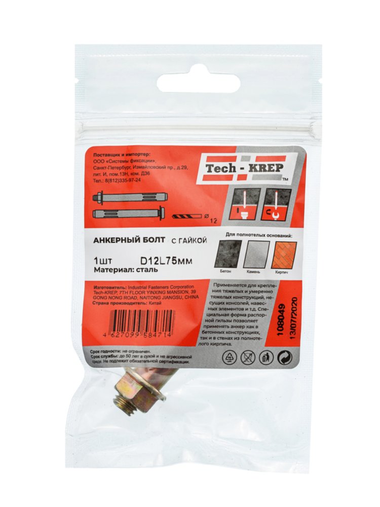 Анкерный болт с гайкой 12х75 мм от Tech-Krep – это надежный крепежный элемент, изготовленный из высокопрочной стали с антикоррозийным покрытием, что обеспечивает долговечность и устойчивость к внешним воздействиям. Диаметр болта 12 мм и длина 75 мм позволяют использовать его для создания прочных соединений в различных строительных конструкциях. Болт оснащен гайкой, что упрощает процесс монтажа и обеспечивает дополнительную надежность крепления. Упаковка содержит 1 штуку, что удобно для точечного применения или небольших объемов работ.