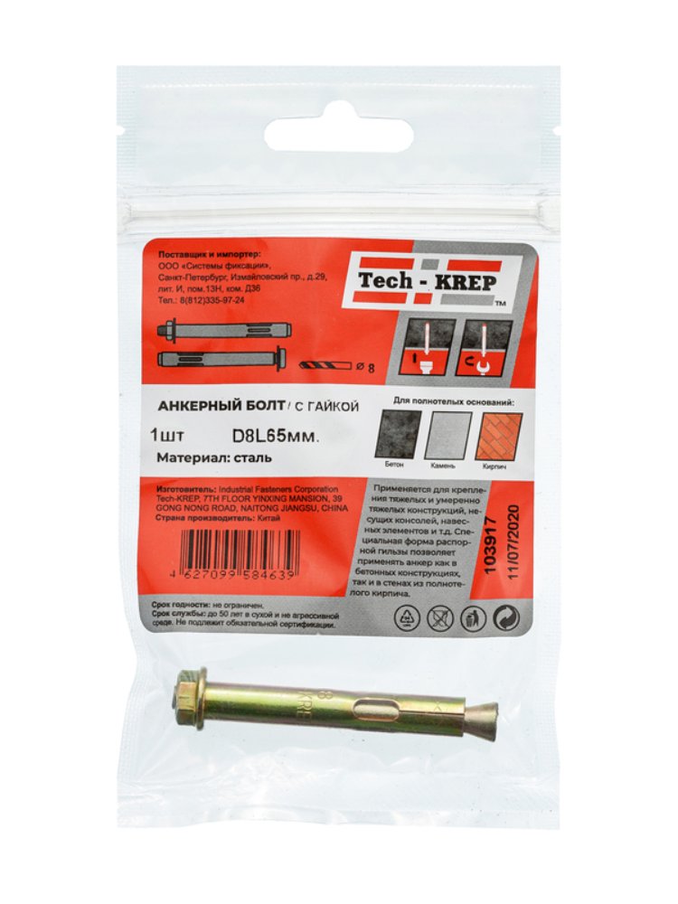 Анкерный болт с гайкой 8х65 от Tech-Krep — надежный крепежный элемент, предназначенный для создания прочных соединений в различных строительных конструкциях. Изготовлен из высококачественной стали с антикоррозийным покрытием, что обеспечивает долговечность даже в условиях повышенной влажности. Диаметр 8 мм и длина 65 мм позволяют использовать его для крепления элементов небольшой и средней нагрузки. Конструкция с гайкой упрощает монтаж и обеспечивает равномерное распределение нагрузки. Упаковка в виде пакета удобна для хранения и транспортировки.