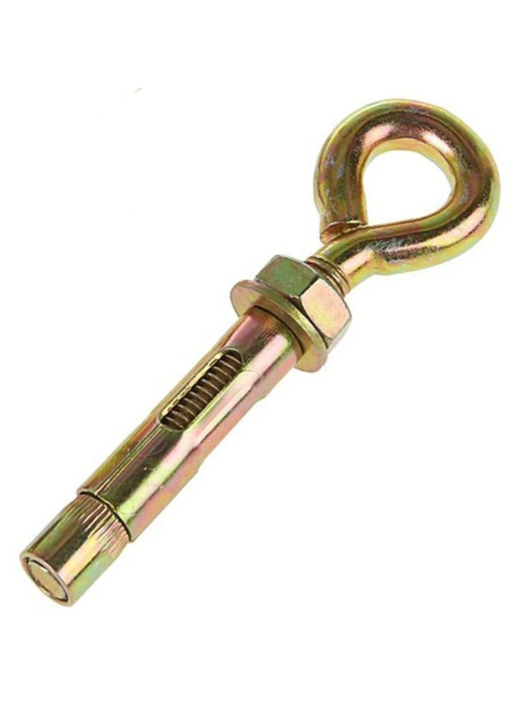 Анкерный болт с кольцом для крепления тяжелых подвесных конструкций к плотным строительным материалам. Оцинкованный анкер с кольцом для бетонных и кирпичных оснований, максимальная нагрузка до 500 кг, удобен для подвесных систем и монтажа.
