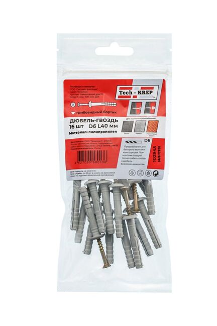 Дюбель-гвоздь 6х40 мм с грибовидной манжетой из полипропилена черного цвета от Tech-Krep предназначен для надежного крепления различных материалов к бетону, кирпичу и другим твердым основаниям. Упаковка содержит 16 штук, что удобно для небольших ремонтных и строительных работ. Конструкция с грибовидной манжетой обеспечивает плотное прилегание к поверхности, предотвращая проскальзывание крепежа. Изделие устойчиво к коррозии благодаря материалу изготовления, что гарантирует долговечность соединения даже в условиях повышенной влажности.