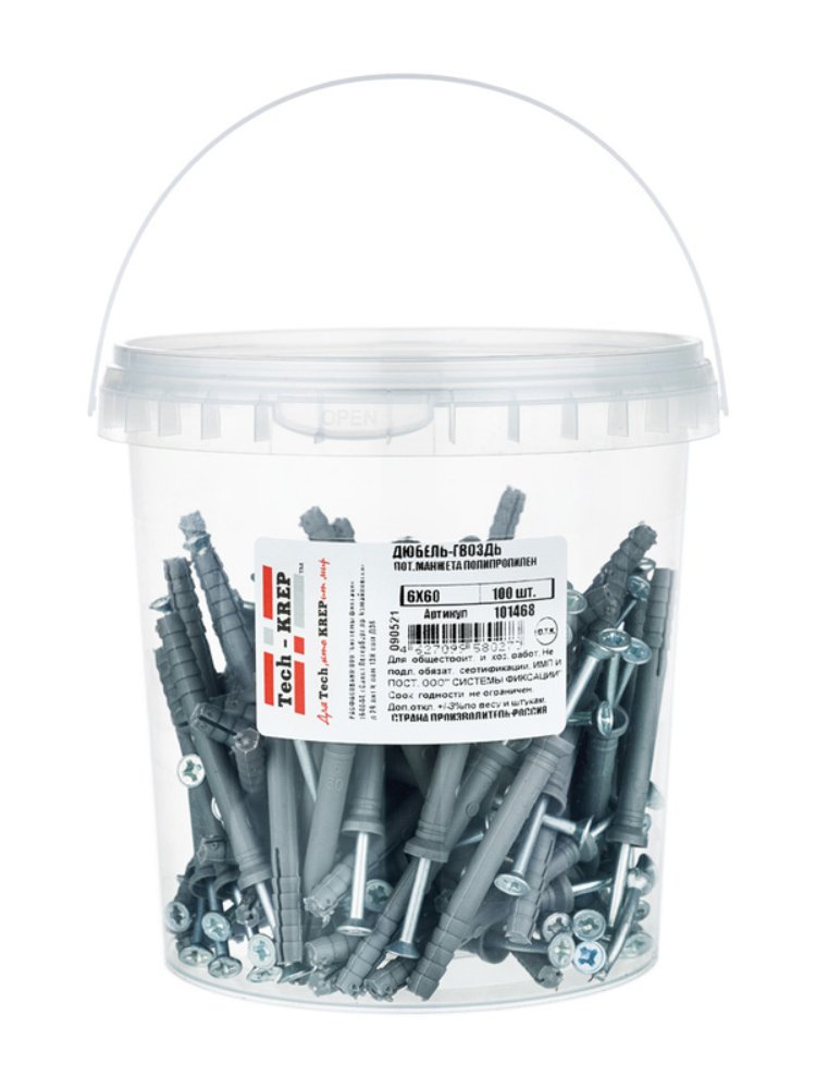 Дюбель-гвоздь 6х60 с потайной манжетой из полипропилена черного цвета от Tech-Krep предназначен для надежного крепления различных конструкций к бетонным, кирпичным и другим твердым основаниям. Упаковка в виде ведра содержит 100 штук, что удобно для больших объемов работ. Дюбель изготовлен из качественного полипропилена, а гвоздь — из прочной стали с антикоррозийным покрытием, что обеспечивает долговечность крепления. Потайная манжета позволяет скрыть крепеж, обеспечивая эстетичный вид поверхности. Подходит для монтажных работ в условиях повышенной влажности благодаря устойчивости материалов к коррозии.