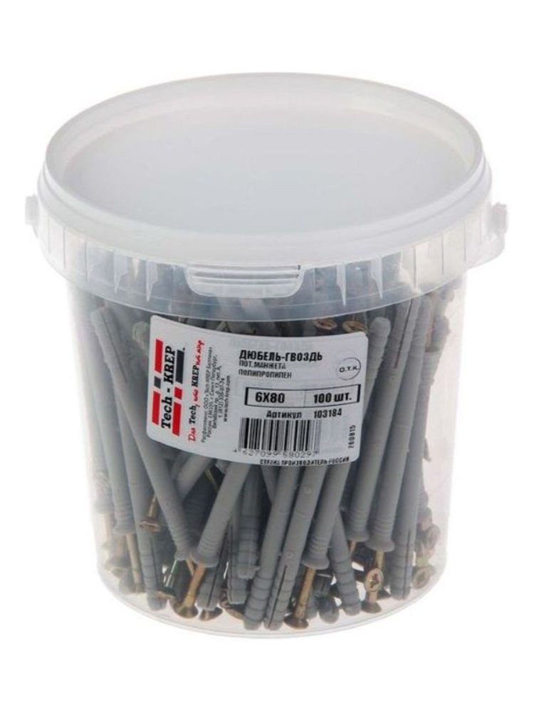Дюбель-гвоздь 6х80 с потайной манжетой из полипропилена черного цвета от Tech-Krep поставляется в удобной упаковке-ведре по 100 штук. Этот крепежный элемент предназначен для надежного монтажа различных конструкций к бетонным, кирпичным и другим твердым основаниям. Изготовлен из прочного полипропилена, что обеспечивает долговечность и устойчивость к механическим нагрузкам. Потайная манжета гарантирует аккуратное завершение крепления, скрывая головку гвоздя и обеспечивая эстетичный вид. Диаметр 6 мм и длина 80 мм делают изделие универсальным для большинства строительных задач.