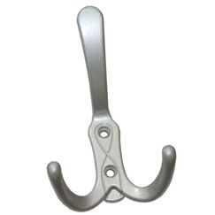 Надёжный металлический крючок на два рожка с серебристым покрытием, подходит для одежды и аксессуаров, прост в установке и долговечен.