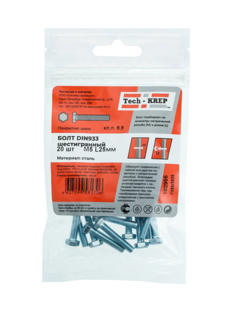 Болт с шестигранной головкой оцинкованный М5х25 от Tech-Krep представляет собой надежный крепежный элемент, изготовленный из углеродистой стали с цинковым покрытием, обеспечивающим защиту от коррозии. Диаметр резьбы составляет 5 мм, длина – 25 мм, что делает его универсальным для различных монтажных работ. Упаковка содержит 20 штук, что удобно для мелких и средних проектов. Соответствует стандарту DIN 933, гарантируя высокое качество и точность размеров. Подходит для использования с гайками и шайбами соответствующего размера.