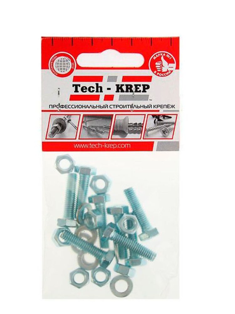 Комплект крепежа включает 8 болтов с шестигранной головкой стандарта DIN 933, размером M6x20, а также соответствующие гайки и шайбы. Все элементы изготовлены из прочной стали с цинковым покрытием, что обеспечивает защиту от коррозии и долговечность даже в условиях повышенной влажности. Болты имеют полную резьбу, что гарантирует надежное соединение деталей. Комплект поставляется в удобной упаковке от Tech-Krep, что упрощает хранение и транспортировку.