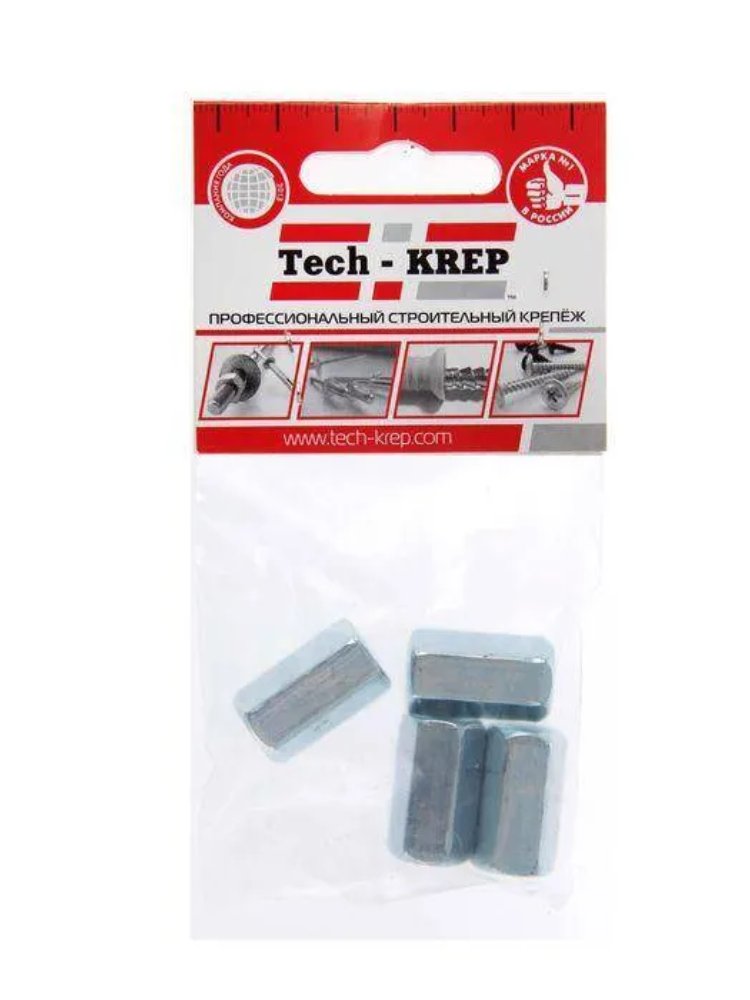 Соединительная гайка стандарта DIN 6334 представляет собой удлиненный шестигранный крепеж с внутренней метрической резьбой М8. Изготовлена из прочной углеродистой стали и имеет цинковое покрытие, которое защищает деталь от коррозии и увеличивает срок службы. Комплект включает 4 штуки, упакованные в удобный пакет от бренда Tech-Krep, что обеспечивает надежное хранение и транспортировку. Используется для соединения элементов конструкций, удлинения шпилек или болтов, обеспечивая прочное и долговечное крепление.