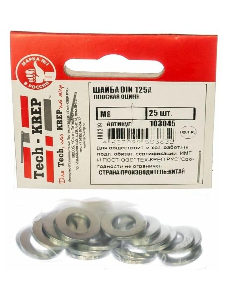 Плоская оцинкованная шайба стандарта DIN 125А размера М8 от Tech-Krep предназначена для увеличения площади опоры крепежных элементов, таких как болты, винты или гайки. Изготовлена из прочной стали с цинковым покрытием, что обеспечивает высокую коррозионную стойкость и долговечность даже в условиях повышенной влажности. В упаковке 25 штук, что удобно для мелких и средних строительных или ремонтных работ. Диаметр внутреннего отверстия составляет 8,4 мм, внешний диаметр — 16 мм, толщина — 1,6 мм, что соответствует стандартным требованиям для крепежа М8.